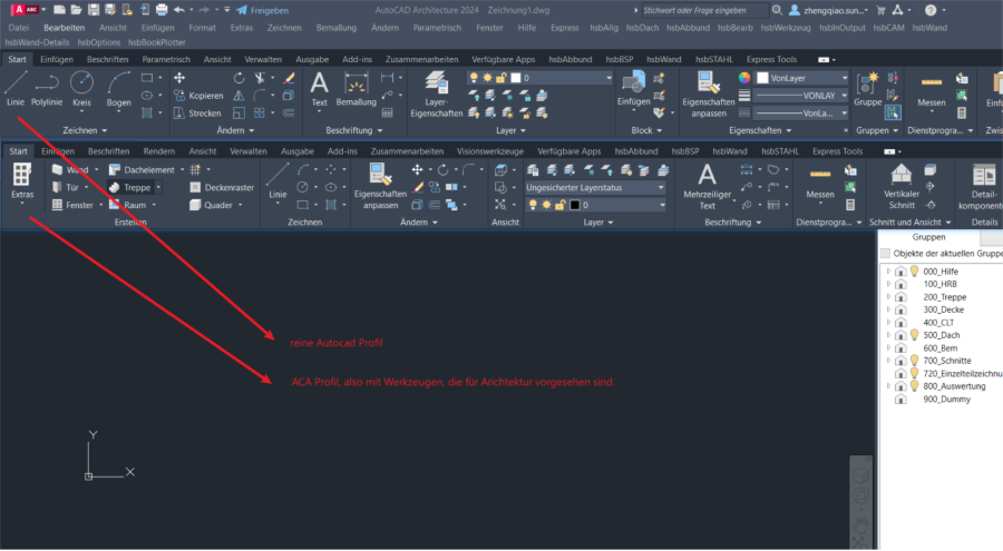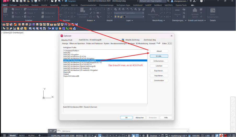 hsbcad benötigt zwingend ein Profil, das auf AutoCAD Architecture (ACA) basiert. Das reine "AutoCAD"-Profil verfügt nicht über die notwendigen Architektur-Werkzeuge.