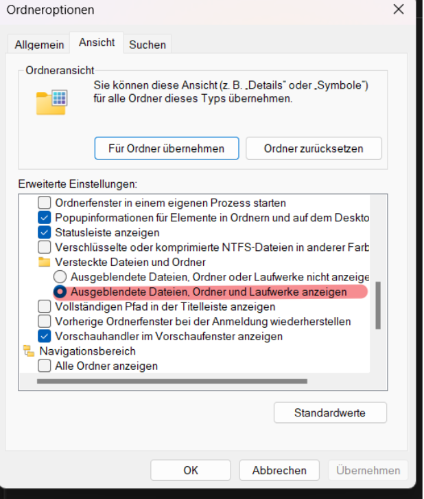 (Alternativ bei älteren Windows-Versionen: Ordneroptionen > Ansicht > "Ausgeblendete Dateien, Ordner und Laufwerke anzeigen")