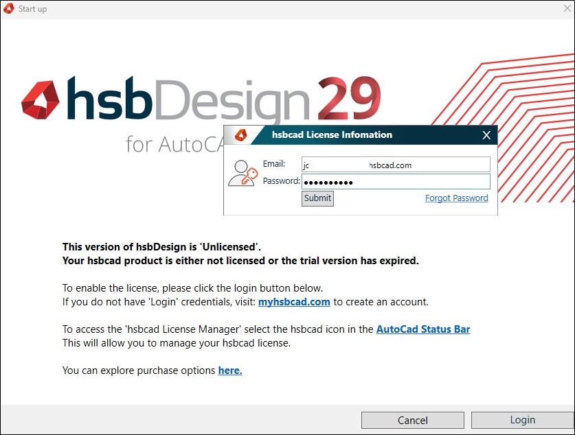 When you first launch hsbDesign29 and you aren't logged in yet, the following dialog box will appear which will start the login process.