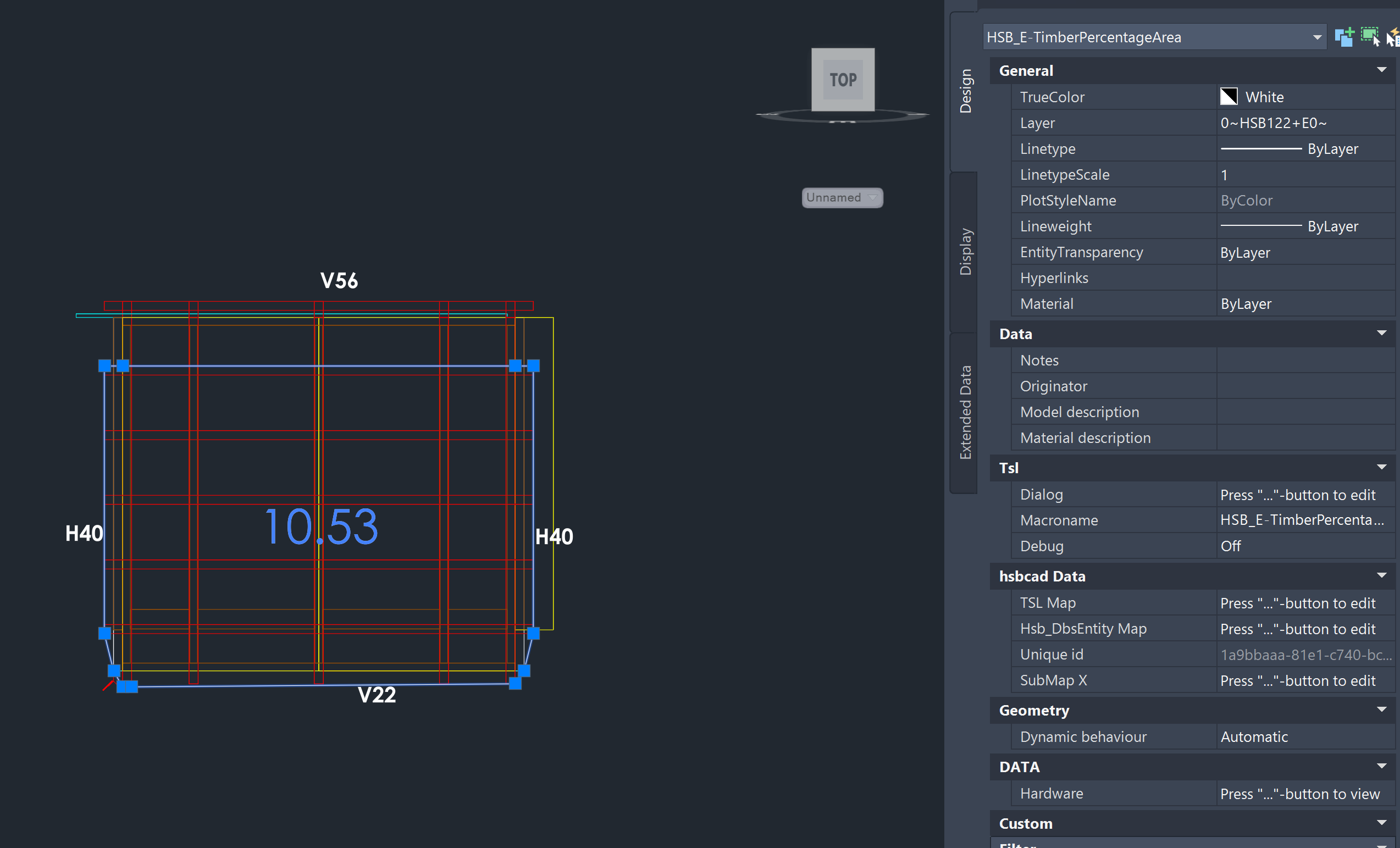 See also the example below where the after inserting the HSB_E-TimberPercentage tsl, the HSB_E-TimberPercentageArea is placed on the element, the opening and outline are visualized with the selected line. In the middle of the element the TimberPercentage is shown, in this case 10.53.