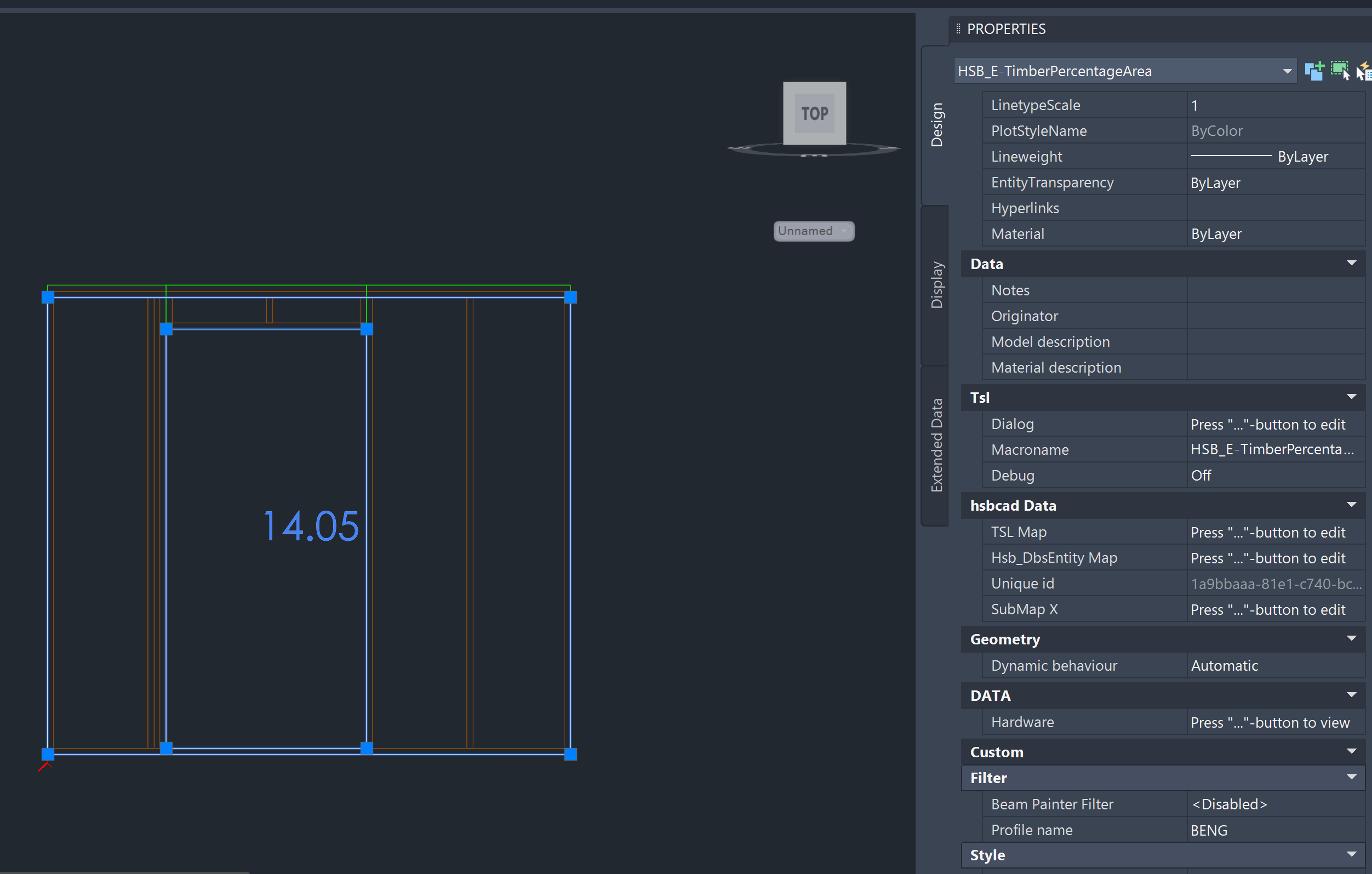 See also the example below where the after inserting the HSB_E-TimberPercentage tsl, the HSB_E-TimberPercentageArea is placed on the element, the opening and outline are visualized with the selected line. In the middle of the element the TimberPercentage is shown, in this case 17.51.